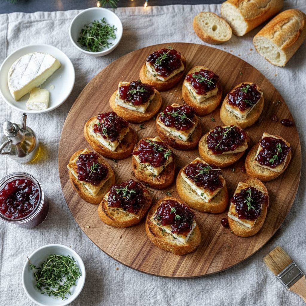 - Arrange the finished Cranberry Brie Crostini on a serving platter.