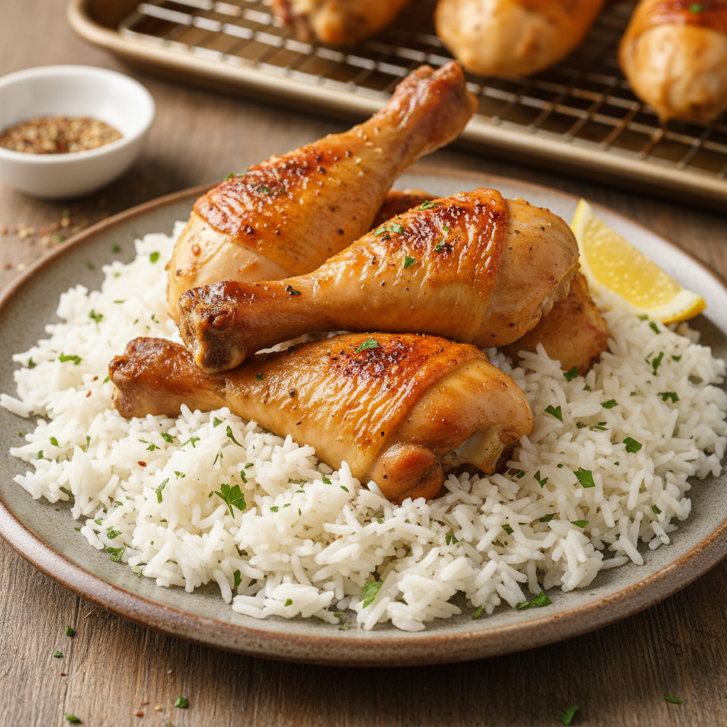 - Fluff and Serve: After resting, remove the lid and gently fluff the rice with a fork. Serve immediately alongside the baked chicken drumsticks.