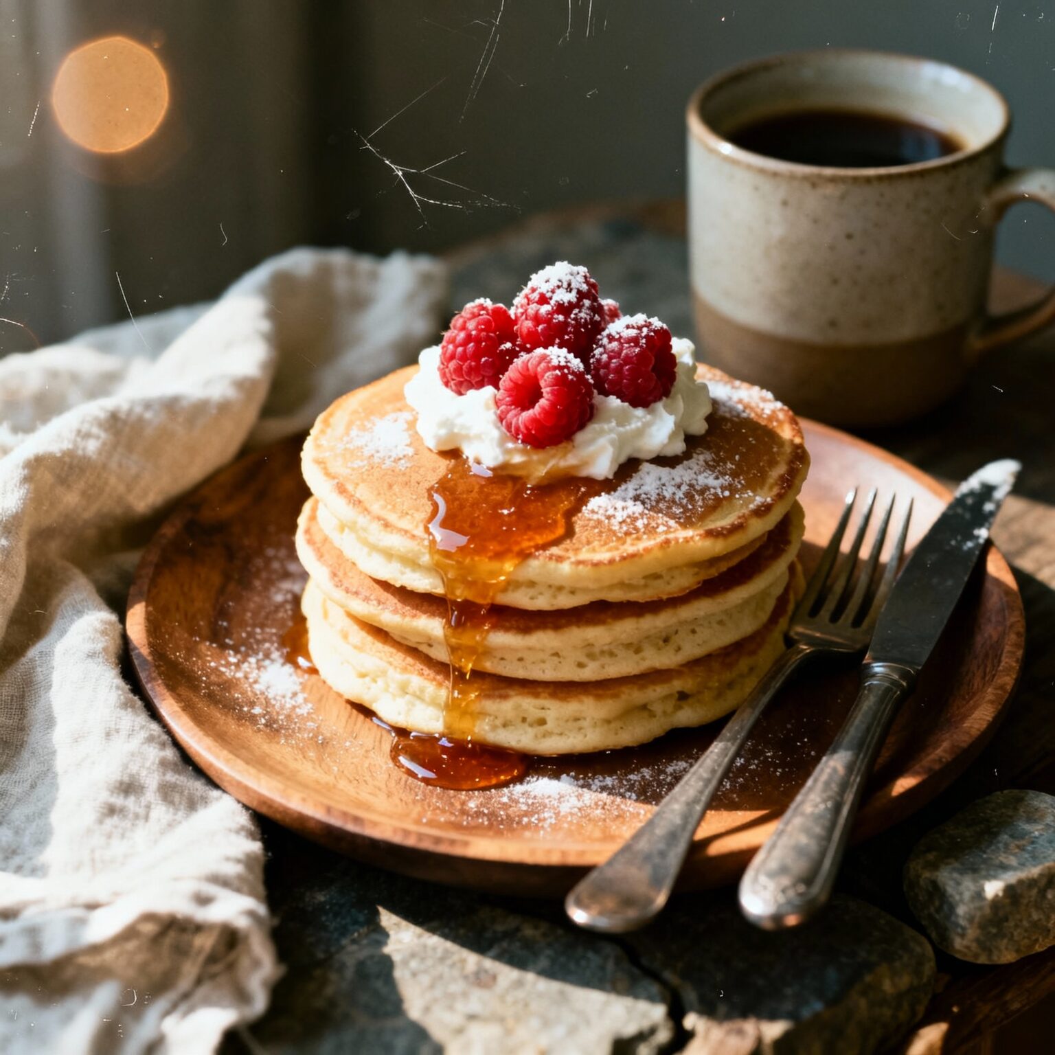 8. Serve: Stack the warm pancakes on plates. Top with fresh or frozen raspberries, a generous drizzle of warm maple syrup, and any other desired toppings. Serve immediately.