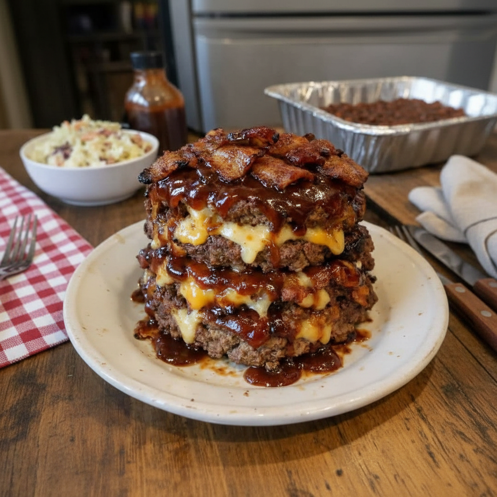 Prepare to have your mind blown and your taste buds utterly delighted by this extraordinary Smoked Bacon Triple-Cheese Cheeseburger Meatloaf Stack! This isn’t just a meal; it’s a culinary event, taking the best elements of a juicy cheeseburger, smoky bacon, and comforting meatloaf, and stacking them into an awe-inspiring, flavor-packed tower. Each layer boasts perfectly seasoned ground beef and pork, loaded with three types of gooey melted cheese, crowned with crispy bacon, and glazed with tangy BBQ sauce. It’s a decadent, hearty, and unbelievably satisfying dish that’s guaranteed to be the star of any dinner table, perfect for special gatherings, game nights, or when you simply crave something spectacularly delicious and comforting.