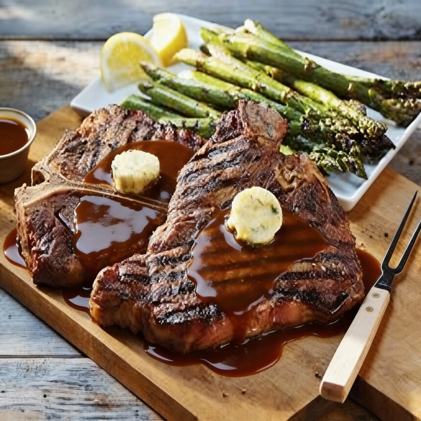 Grilled T-Bone Steaks with Compound Butter & Asparagus