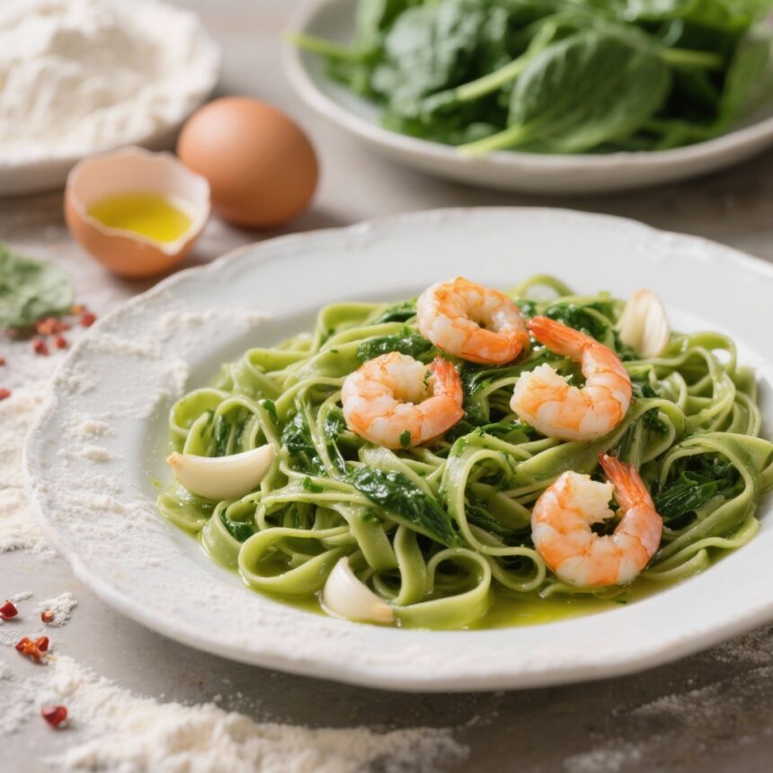 Homemade Green Tagliatelle Italian Pasta with Shrimp