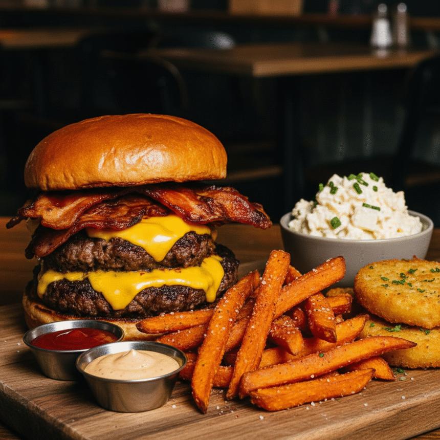 American Fat Smash Burger with Grilled Bacon, Cheese, and Toasted Potato Buns