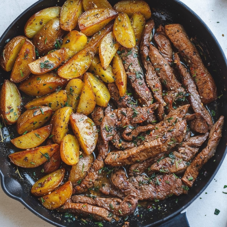 Prepare for a dazzling yet approachable weeknight meal with this Skillet Seared Steak with Garlic Herb Potatoes! This dish masterfully combines tender, perfectly seared steak strips with crispy, golden-brown potatoes infused with aromatic garlic and herbs, all cooked to perfection in a single skillet. It's a symphony of textures and flavors…