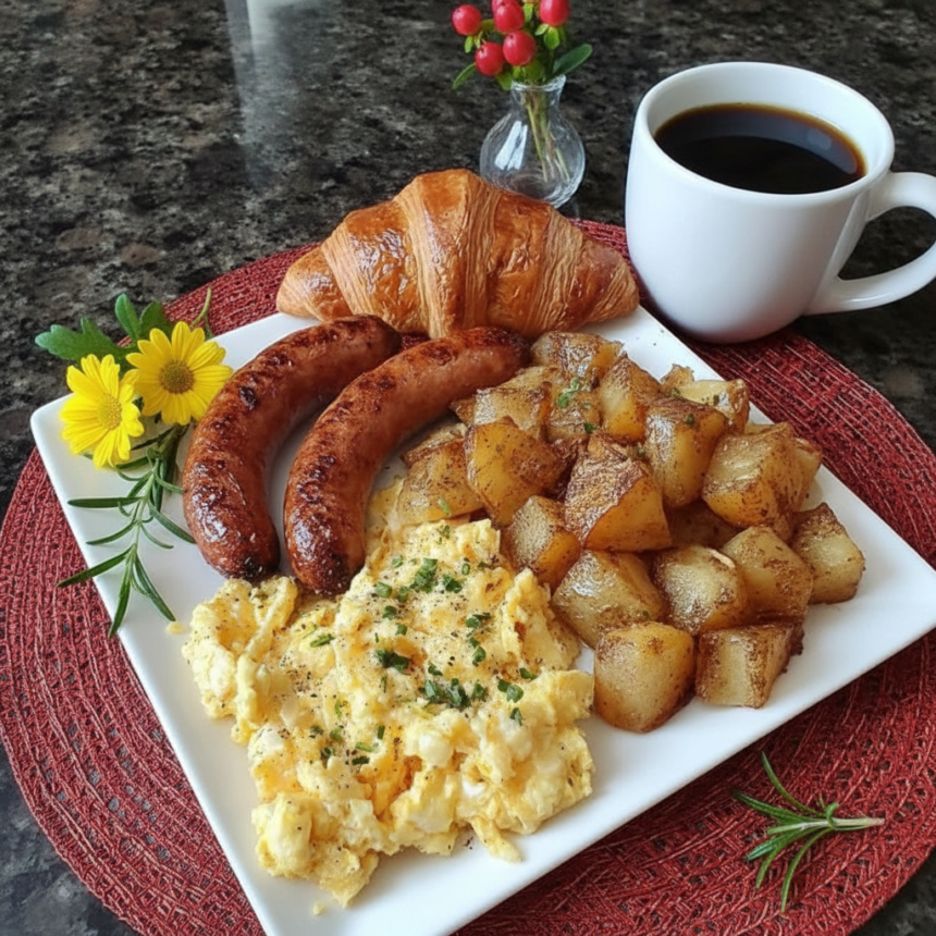 Wake up to a truly satisfying and indulgent start with this Hearty American Breakfast Platter! This is the kind of breakfast that promises to fuel your day and delight your senses, bringing together all the classic favorites on one glorious plate. Imagine fluffy scrambled eggs, perfectly browned breakfast sausages, crispy-edged home…