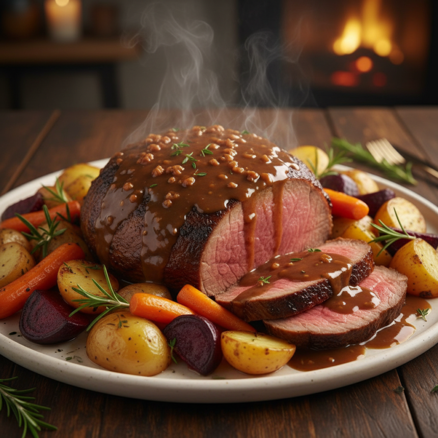 Roasted Ground Moose with Root Vegetables and Rich Brown Gravy