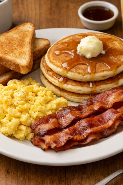 The Classic American Breakfast Plate: Eggs, Bacon, Pancakes & Toast