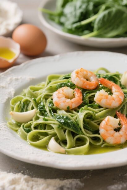 Homemade Green Tagliatelle Italian Pasta with Shrimp