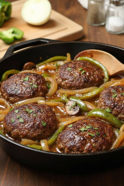 Skillet Beef Patties with Peppers and Onions in Gravy