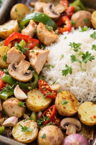 Spicy Chicken Stir-Fry with Herb Potatoes & Fluffy Rice