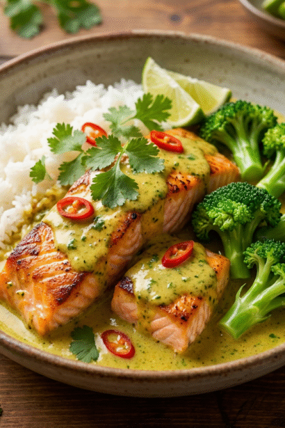 Creamy Coconut Curry Salmon with Tender Broccoli