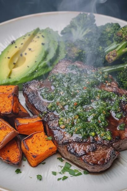 Steak with Fresh Chimichurri, Sweet Potato Bites & Broccolini